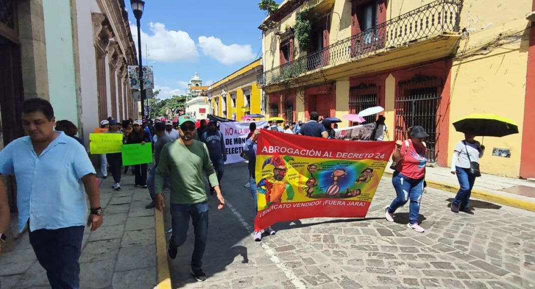Trabajadores del Sindicato de Burócratas del Gobierno del Estado de Oaxaca marcharon ayer en la capital para denunciar la presunta intención de las autoridades estatales de imponer un nuevo impuesto a sus salarios, con el fin de cubrir una deuda de 600 millones de pesos con el SAT.