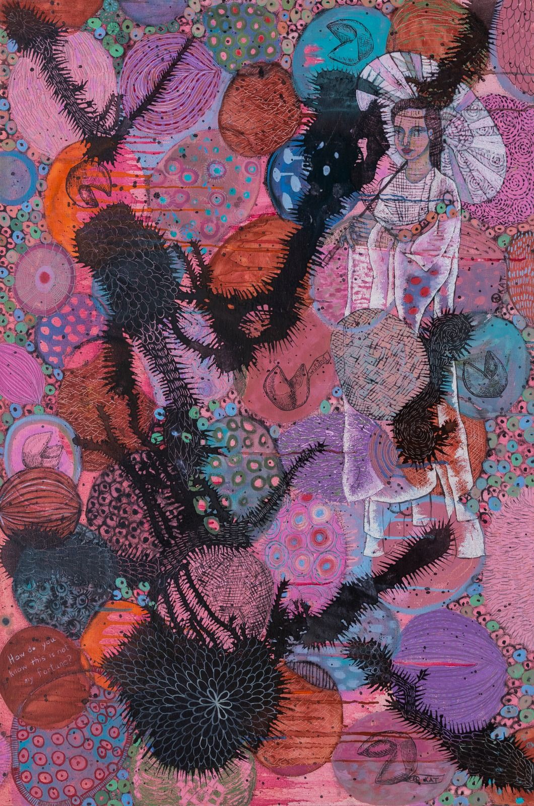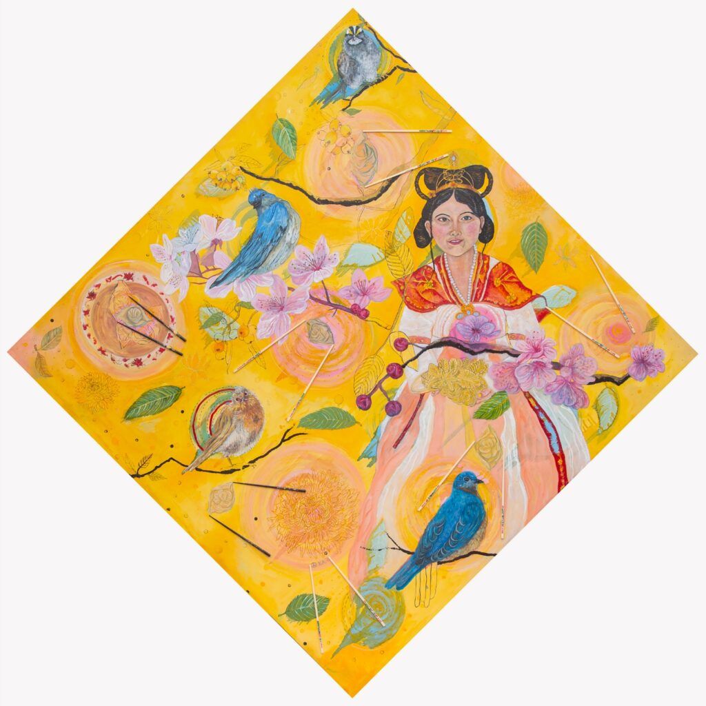 Finalmente, la pintora interpola historias ficticias de amor y mestizaje entre personajes de China y México, equiparando esas historias con el mito apuleyano de Cupido y Psique. Así, el amor resulta un vehículo de sanación a toda prueba. Esta victoria, para la artista Peace KAT, “implica transformaciones como el surgimiento de alas de mariposa de Psique, o cambios a gran escala de conciencia, actitudes y territorios”.