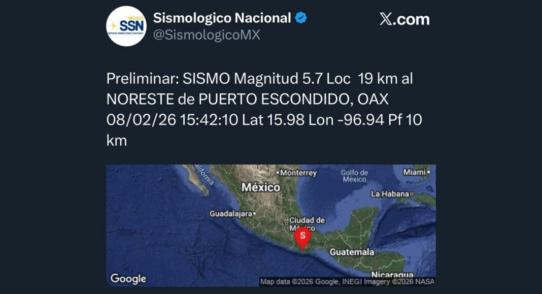 La Coordinación Estatal de Protección Civil y Gestión de Riesgos, la CEPCyGR, informó que no se registraron daños mayores ni personas lesionadas tras el sismo de magnitud 5.7, ocurrido este domingo a las 15:42 horas, con epicentro al noreste de Puerto Escondido.